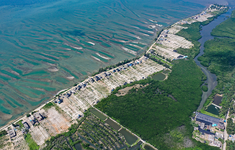 将养殖场和池塘清退后的海南省文昌市冯家湾一类生态红线区,通过种植树木等方式修复生态环境(6月1日摄,无人机照片)。新华社记者 郭程 摄