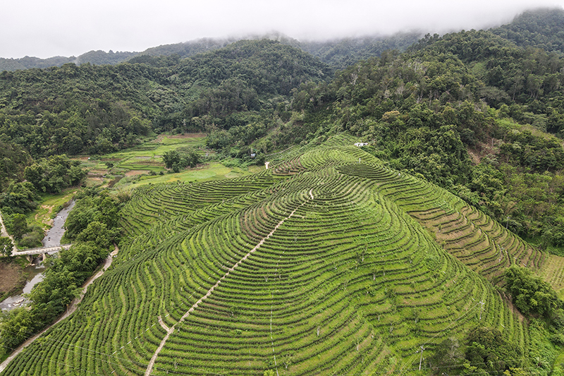 五指山脚下的一个茶园(5月18日摄,无人机照片)。新华社记者 张丽芸 摄
