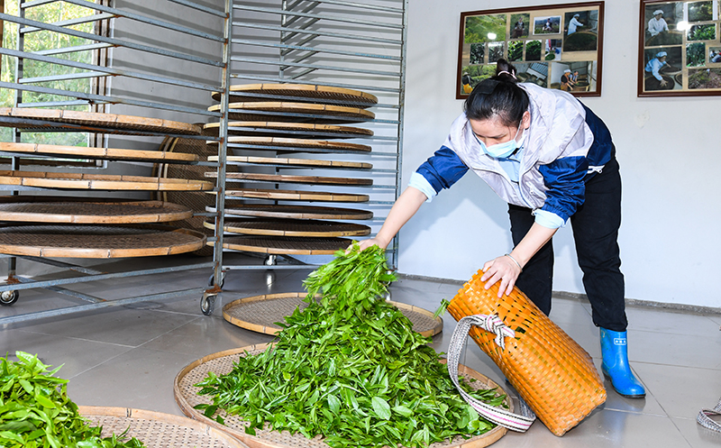 4月10日,在海南省五指山市水满乡毛纳村,茶农在手工茶坊内工作。新华社记者 杨冠宇 摄
