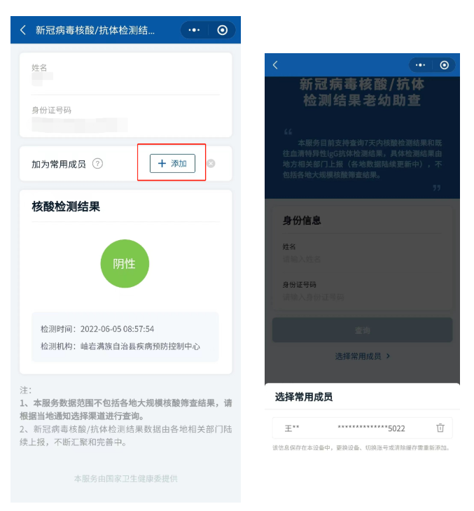常用成员功能:支持添加5名常用成员,后续可快捷查询核酸/抗体检测结果。常用成员信息将保存在当前设备中,请勿在公共或不可靠的设备上储存添加,如更换设备、切换账号或清除缓存需重新添加。