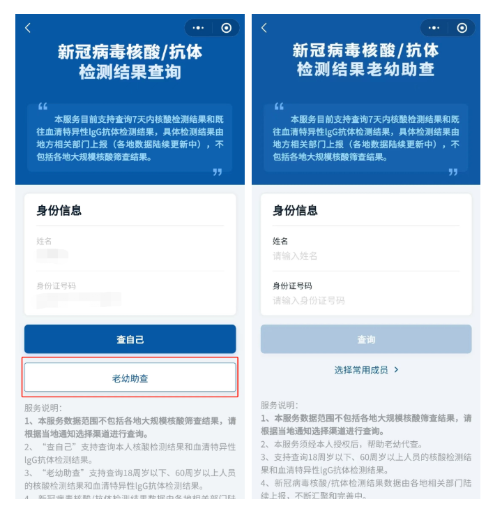 “老幼助查”功能:支持查询18周岁以下、60周岁以上人员7天内的核酸检测结果和血清特异性IgG抗体检测结果,数据由各地相关部门上报。