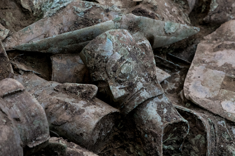 这是在三星堆遗址8号“祭祀坑”拍摄的铜人像(6月1日摄)。新华社记者 王曦 摄