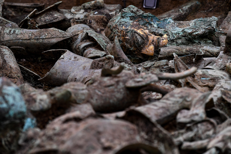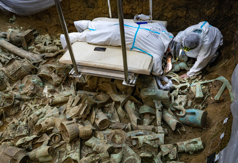2020年以来,四川省文物考古研究院、北京大学、四川大学等科研机构和高校组成联合考古队在三星堆祭祀区开展发掘,在1986年发现的1、2号“祭祀坑”旁边,相继发现、发掘了距今约3000年的3号至8号六个“祭祀坑”。截至目前,六个“祭祀坑”共出土编号文物近13000件,其中相对完整的文物3155件。