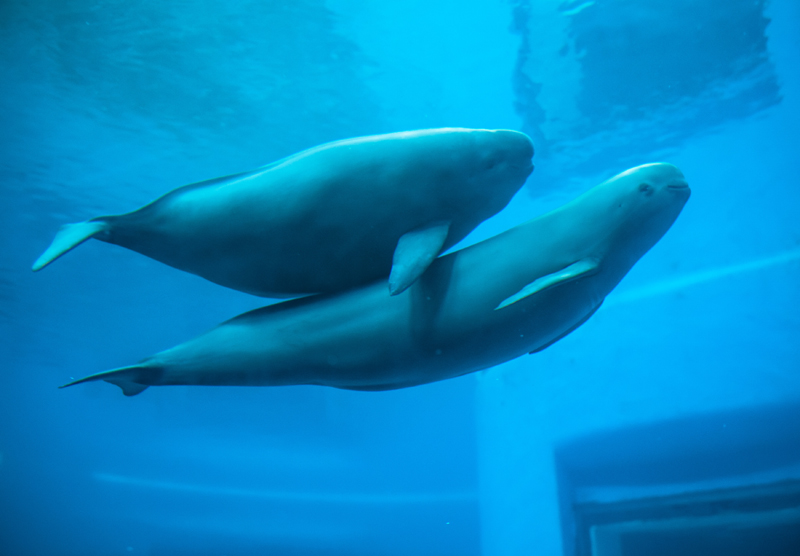在位于武汉的中国科学院水生生物研究所,长江江豚妈妈和小江豚在水中游动(2021年7月5日摄)。新华社记者 肖艺九 摄