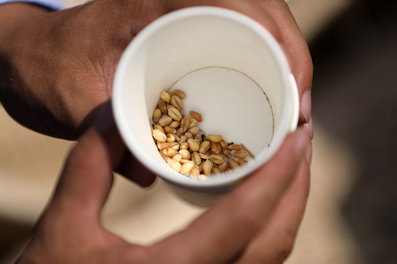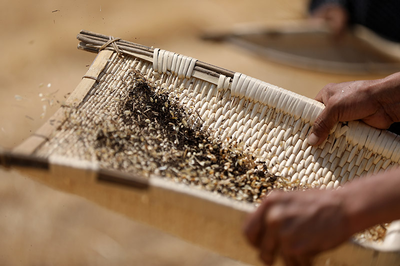 6月2日,在山东省临沂市郯城县郯城街道,裁判组工作人员扬去杂质提取麦粒,测算减损率。新华社发(张春雷 摄)