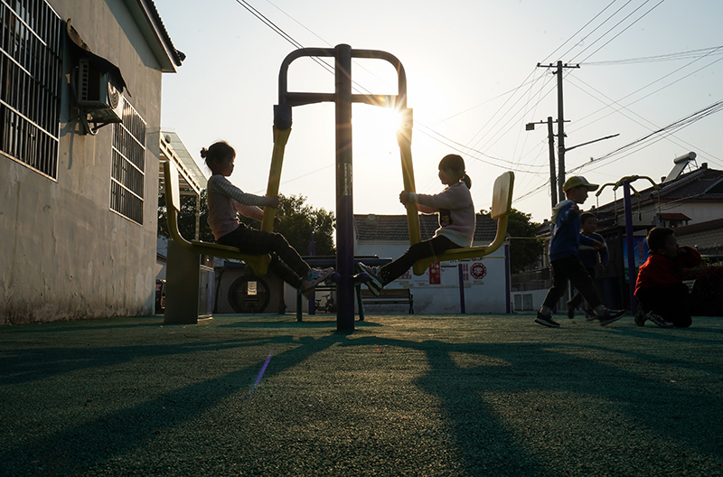 小朋友在镇江市世业镇永茂圩自然村的文化活动广场玩耍(2020年4月13日摄)。新华社记者 季春鹏 摄