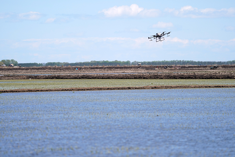 无人机在北大荒集团七星农场有限公司一块稻田中作业(5月18日摄)。新华社记者 王建威 摄