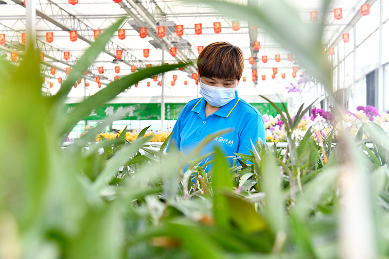 5月18日,在临沂市兰陵县代村现代农业示范园,工作人员在打理蝴蝶兰。新华社记者 郭绪雷 摄