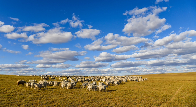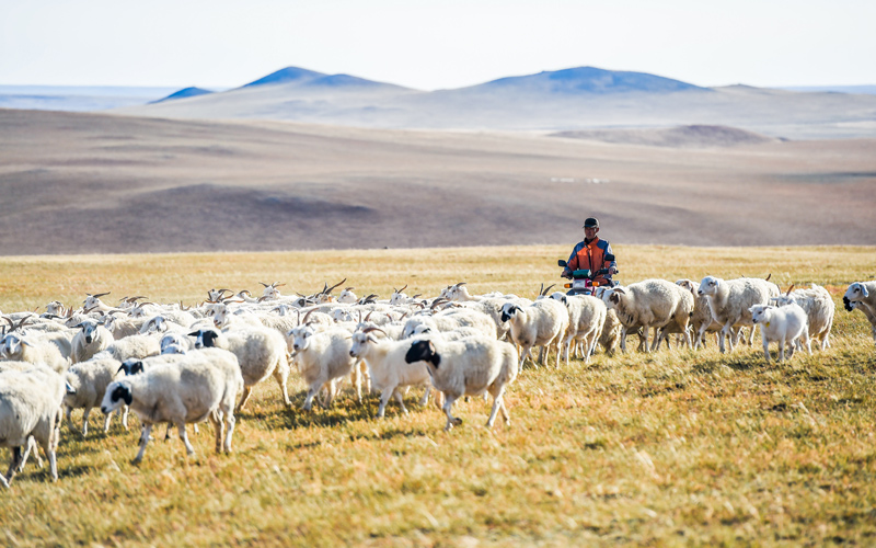内蒙古锡林浩特市宝力根苏木牧民玛吉格的儿子钢苏格拉在草原上放羊(2017年9月16日摄)。新华社记者 连振 摄