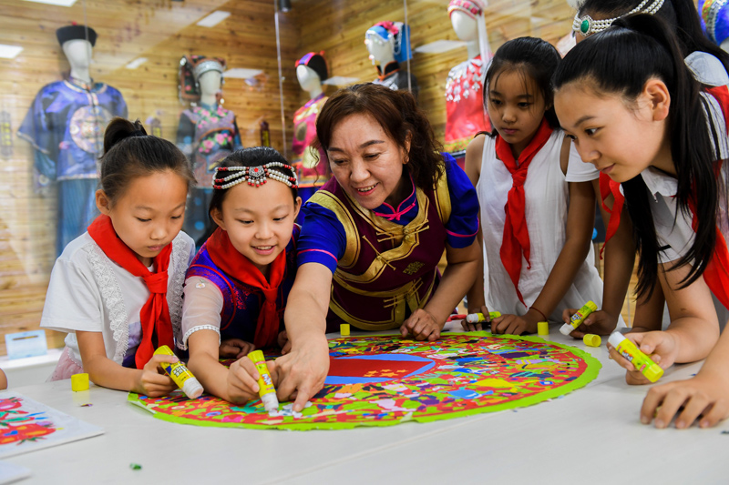 这是2019年7月15日拍摄的赤峰市松山区兴安街道临潢家园社区的民族融合小课桌。新华社记者 刘磊 摄