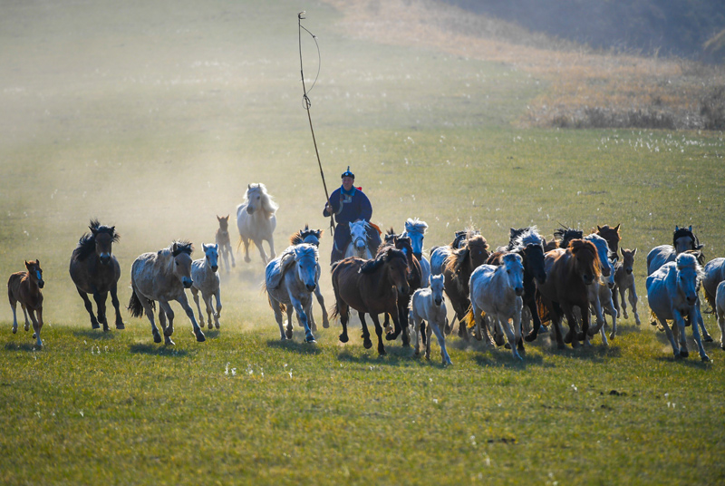 内蒙古锡林郭勒盟西乌珠穆沁旗的牧民在驱赶马群(5月17日摄)。新华社记者 彭源 摄