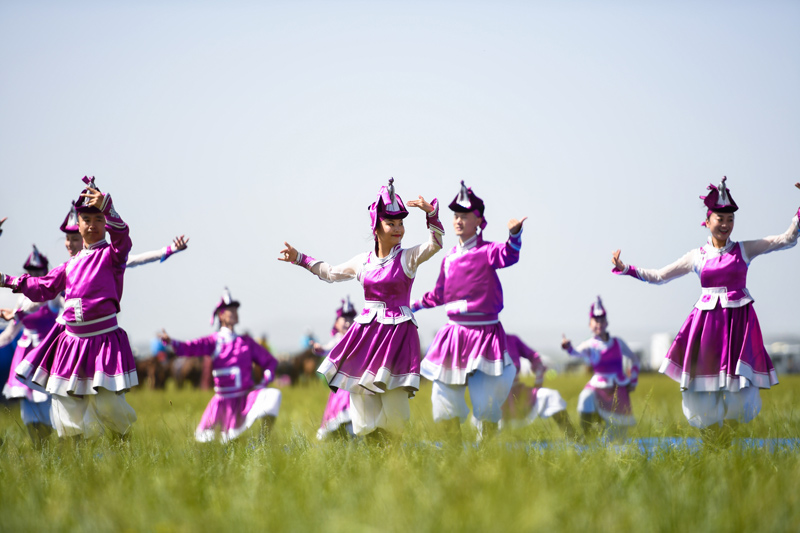 表演者在锡林浩特市游牧文化节·白音锡勒牧场建场70周年那达慕开幕式上表演传统舞蹈(2020年8月2日摄)。新华社记者 彭源 摄