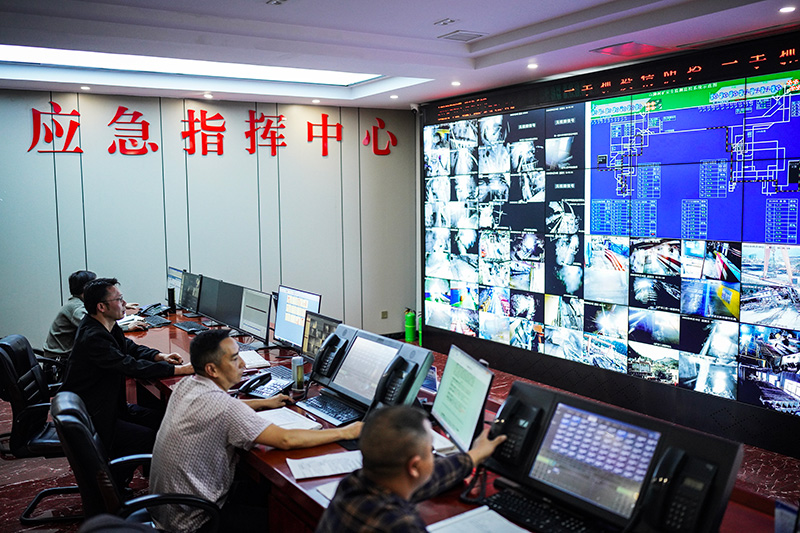 贵州盘江精煤股份有限公司山脚树矿矿长王海涛(左二)与管理人员在应急指挥中心进行综合调度(5月18日摄)。新华社记者 陶亮 摄
