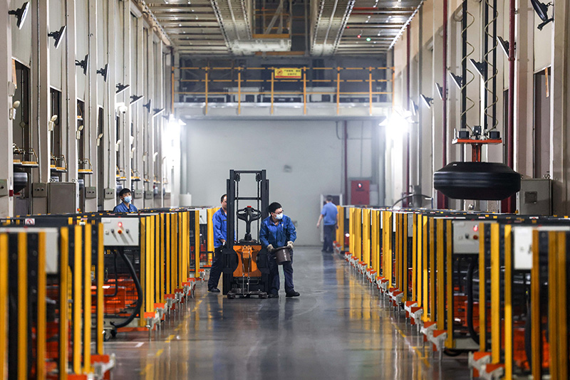 AGV无人搬运小车在贵州轮胎股份有限公司“5G全连接工厂”的部件生产区内工作 (5月17日摄)。新华社记者 欧东衢 摄