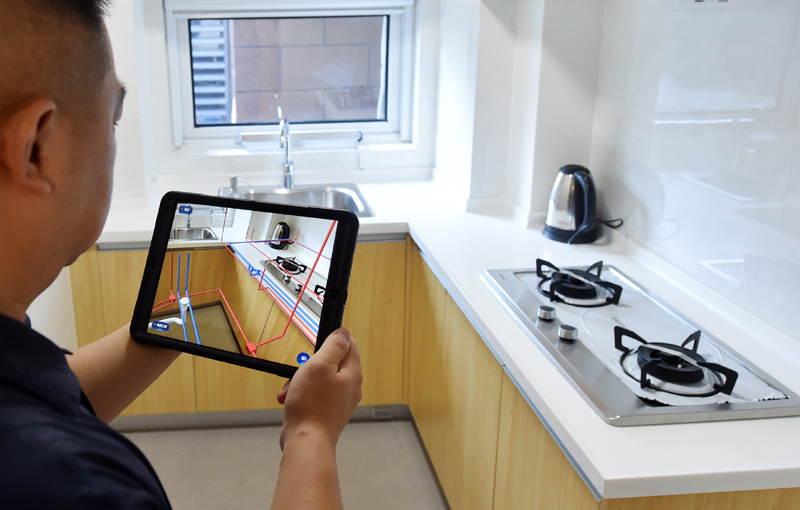 在中新天津生态城一小区,小区业主通过AR房屋使用说明书查看厨房管道线路(2020年8月13日摄)。新华社记者 赵子硕 摄