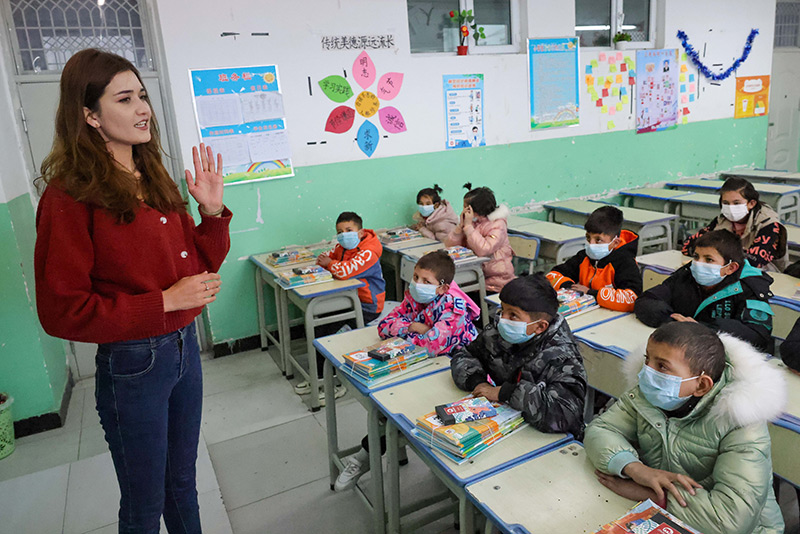 在新疆塔什库尔干塔吉克自治县城乡寄宿制小学,老师在给学生上开学第一课(2月26日摄)。新华社记者 丁磊 摄
