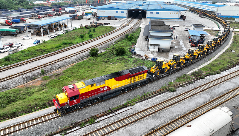 4月29日,满载工程机械设备的中越跨境班列从广西柳州市柳州南物流中心驶出(无人机照片)。新华社发(黎寒池 摄)