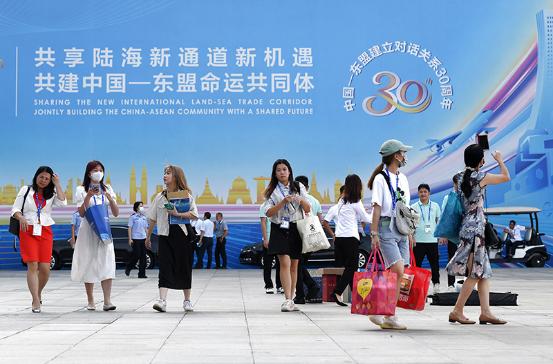 2021年9月11日,在广西南宁国际会展中心,参观者走出第18届中国—东盟博览会展馆。新华社记者 陆波岸 摄