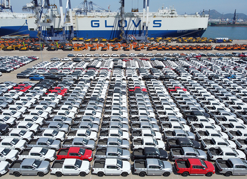5月9日,大批出口商品车在山东港口烟台港集结等待装船(无人机照片)。新华社发(唐克 摄)
