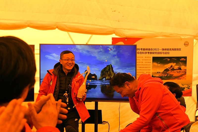 在珠峰脚下海拔5200米的总指挥会议室帐篷里,大家热烈庆祝“巅峰使命”珠峰科考登顶观测采样成功(5月4日摄)。新华社记者 姜帆 摄
