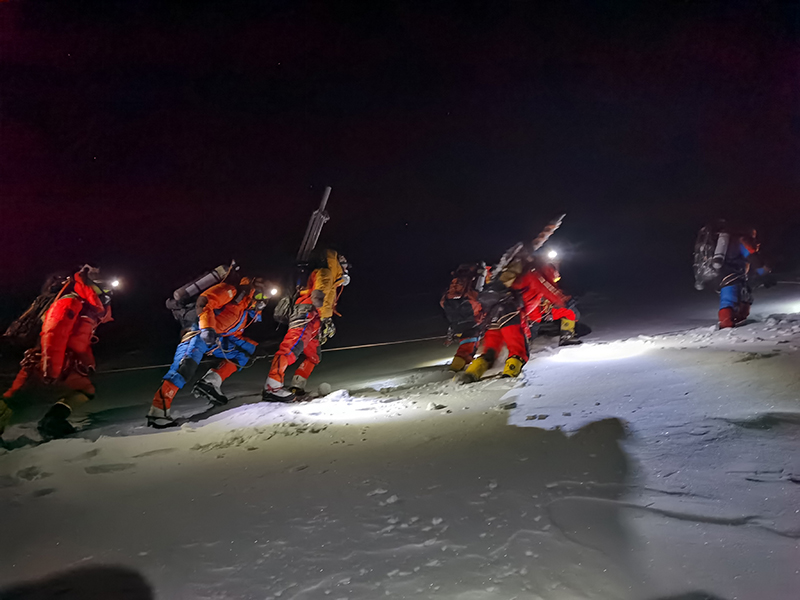 4日凌晨3点,扎西平措等7名科考队员,背着零部件向目标位置挺进。经过8个多小时的攀登,终于抵达海拔8830米处。他们为了完成这次任务,从去年就开始接受气象站安装、调试的培训。