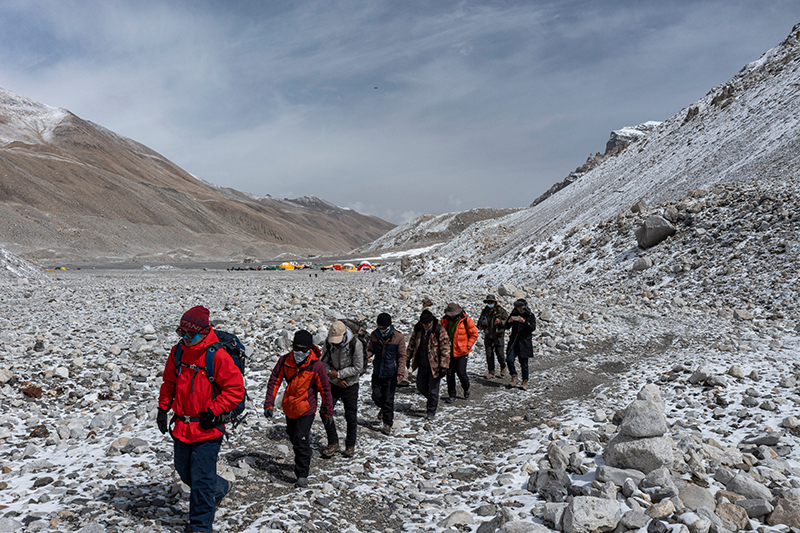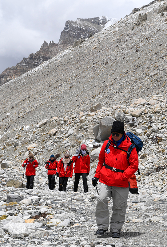 朱彤(右一)和科研人员在珠峰大本营和东绒布冰川间徒步穿梭(5月1日摄)。新华社记者 姜帆 摄
