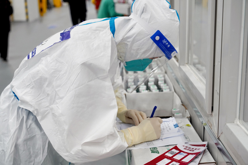 4月30日,上海临港方舱医院的医护人员在整理感染者信息。新华社记者 杨有宗 摄