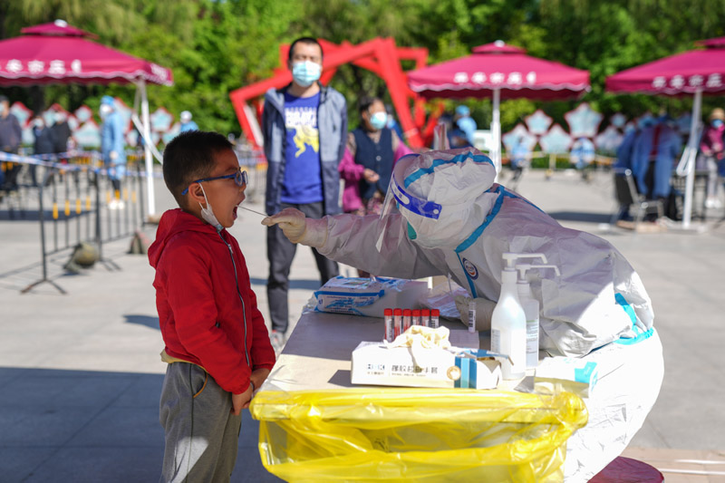 4月30日,在北京市大兴区亦庄镇一核酸采样点,医护人员为市民进行核酸采样。新华社记者 彭子洋 摄