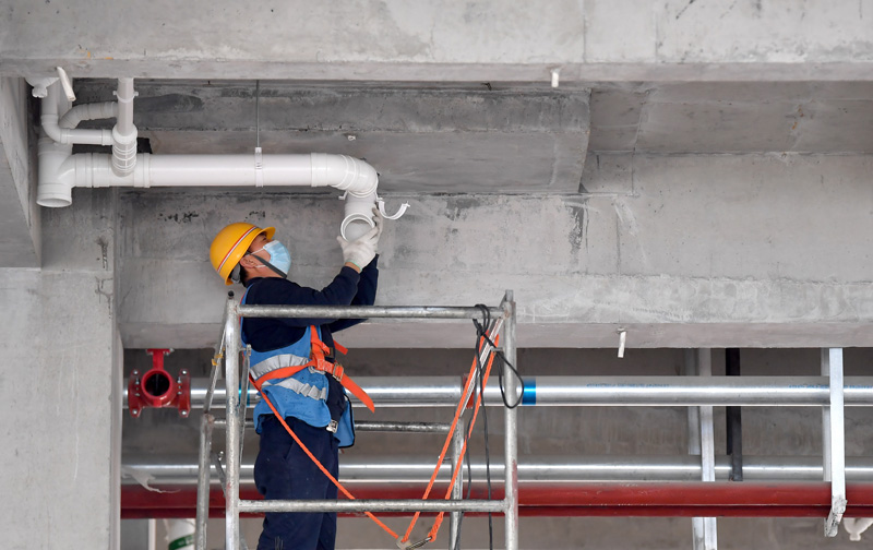 5月1日,中建二局陕西分公司的工人在陕西国际商贸学院项目工地施工。新华社记者 刘潇 摄