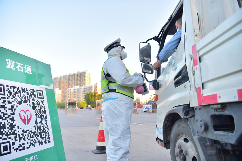5月1日,在石家庄石黄高速晋州站口,交警对出站车辆进行检查。新华社发(张晓峰 摄)