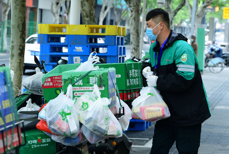 4月30日,在江苏省太仓市一家生鲜电商配送点,配送小哥在整理当天准备配送的生鲜订单。新华社发(计海新 摄)