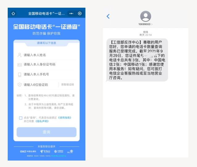 填写姓名、身份证号码和手机号码,核验通过即可预约查询名下所有移动电话卡数量。48小时内,专用短信端口10699000会向预留的手机号码反馈结果!