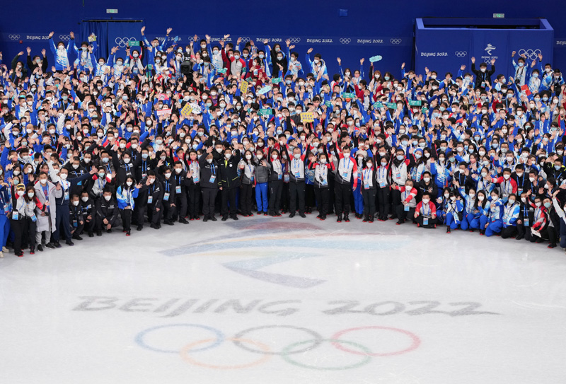 2022年2月20日,工作人员和志愿者在北京首都体育馆举行的北京冬奥会花样滑冰表演滑后合影留念。新华社记者 王毓国 摄