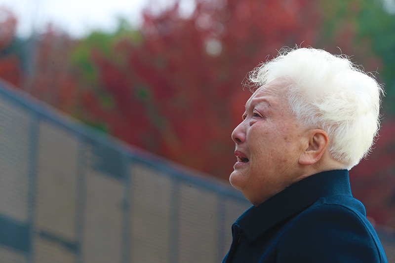 2021年10月25日,李征明烈士的妹妹李曼在沈阳抗美援朝烈士陵园烈士英名墙前怀念哥哥。新华社记者 杨青 摄