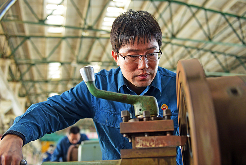 王尚典在中国石油天然气集团公司锦西石化分公司机械厂金工车间工作(2017年2月22日摄)。新华社记者 杨青 摄