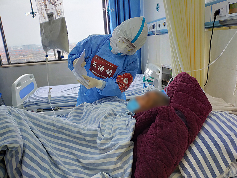 在湖北省襄阳市第一人民医院隔离病房,王语嫣和听不清声音的新冠肺炎疑似患者写字交流(2020年3月8日摄)。新华社发