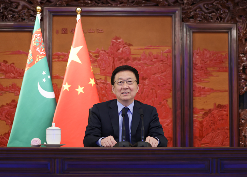 3月30日,中共中央政治局常委、国务院副总理、中土合作委员会中方主席韩正在北京通过视频方式会晤来华访问的土库曼斯坦副总理兼外长、中土合作委员会土方主席梅列多夫。新华社记者 丁海涛 摄