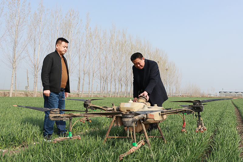 这是山东汶上县苑庄镇道立种植农民专业合作社理事长张道立(右)查看农用无人机(3月24日摄)。新华社发(刘娜 摄)