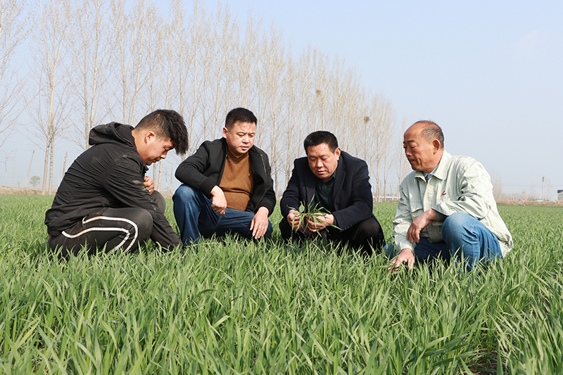 这是山东汶上县苑庄镇道立种植农民专业合作社理事长张道立(右二)与同事查看苗情(3月24日摄)。新华社发