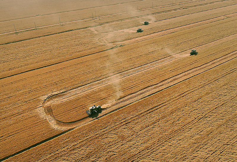 在河南省黄泛区农场九分场的麦田里,农机手操作收割机收获小麦(2021年6月6日摄,无人机照片)。新华社记者 李安 摄