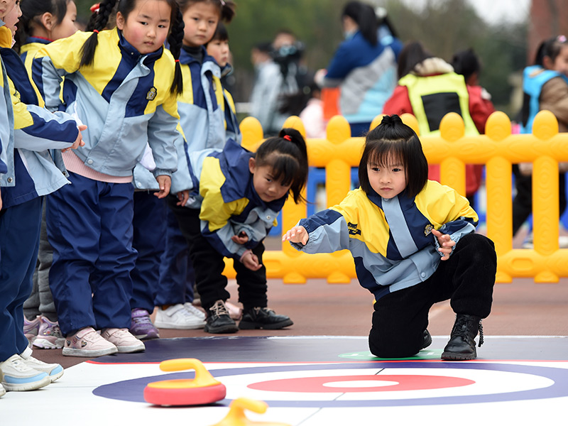 2月16日,安徽省合肥市泰山路幼儿园的小朋友在开学典礼上体验“旱地冰壶”游戏。新华社记者 周牧 摄