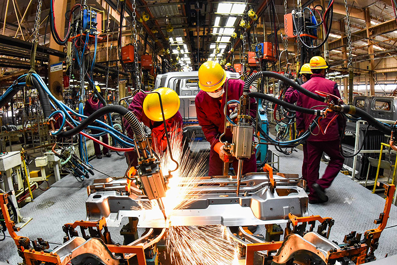 2021年2月28日,工人在山东省青州市一家汽车制造企业的冲焊车间内进行生产作业。新华社发(王继林 摄)