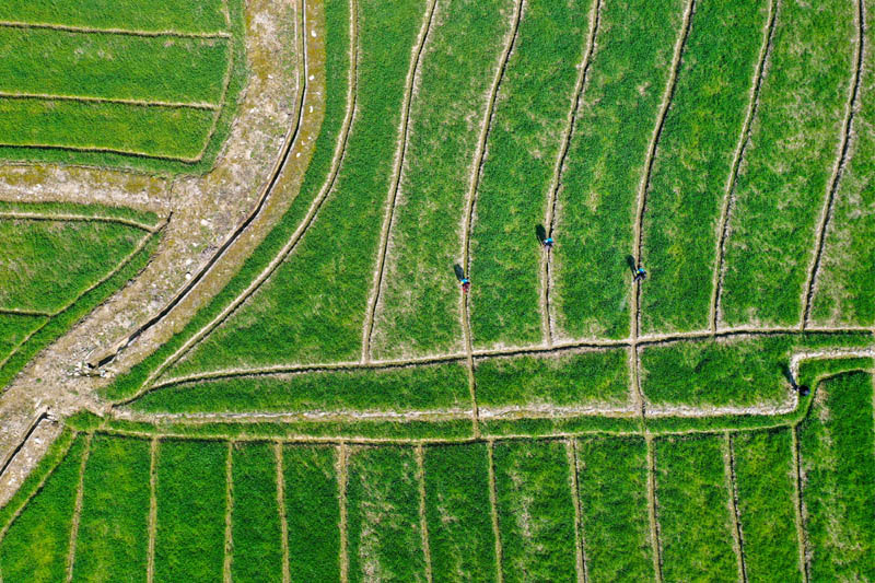 3月9日,浙江省宁波市鄞州区东吴镇天童村村民在田间管护农作物(无人机照片)。新华社发(胡学军 摄)