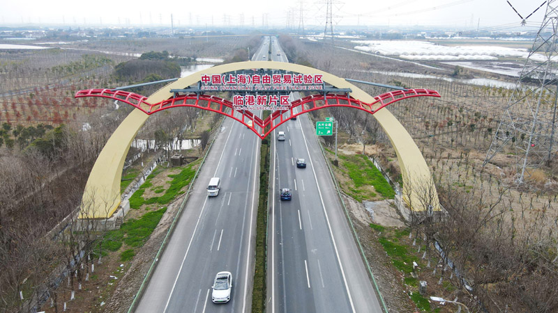 S2沪芦高速上的中国(上海)自由贸易试验区临港新片区“海鸥门”(2月10日摄,无人机照片)。新华社记者 方喆 摄