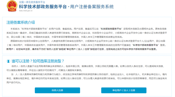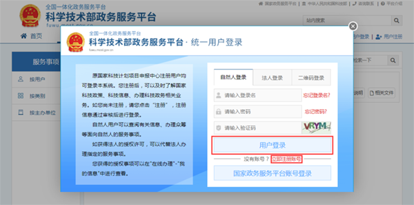 首次申请的用户,需先点击【立即注册账号】完善自然人或单位法人信息,然后点击【注册】。