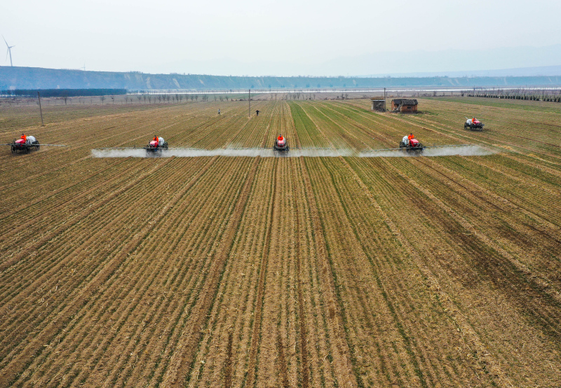 2月22日,高地隙植保机在山西省运城市芮城县新村作业(无人机照片)。新华社记者 柴婷 摄
