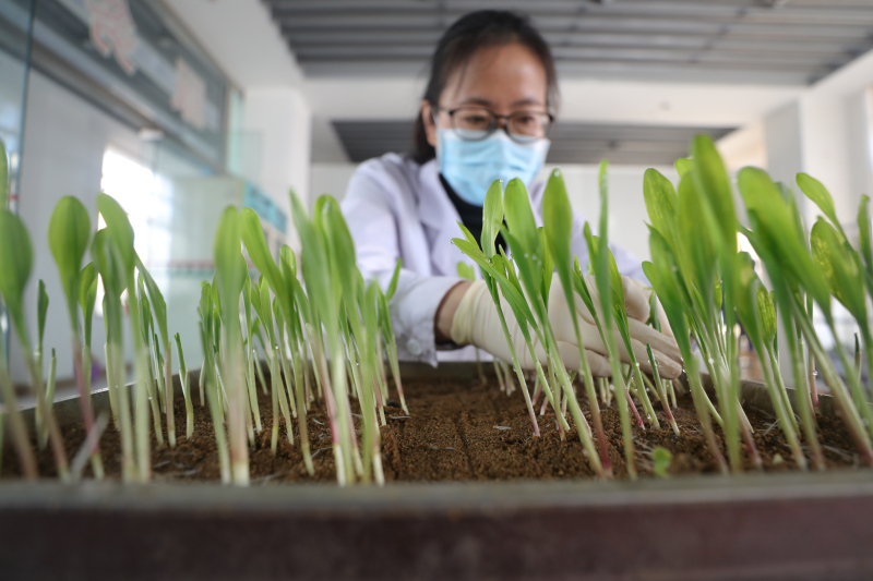 在辽宁东亚种业有限公司种子质量检测中心,工作人员查看玉米种子发芽实验结果(2020年3月16日摄)。新华社记者 杨青 摄