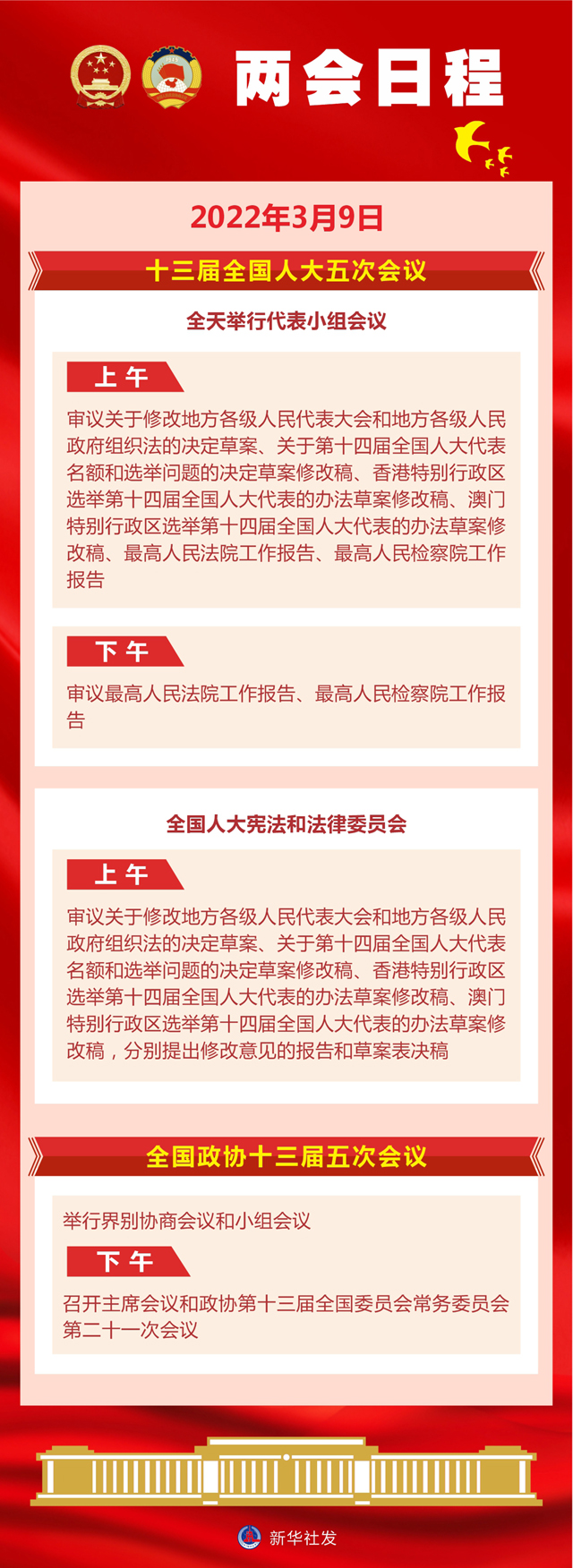 新华社北京3月8日电 十三届全国人大五次会议9日全天举行代表小组会议。上午,审议关于修改地方各级人民代表大会和地方各级人民政府组织法的决定草案、关于第十四届全国人大代表名额和选举问题的决定草案修改稿、香港特别行政区选举第十四届全国人大代表的办法草案修改稿、澳门特别行政区选举第十四届全国人大代表的办法草案修改稿、最高人民法院工作报告、最高人民检察院工作报告;下午,审议最高人民法院工作报告、最高人民检察院工作报告。