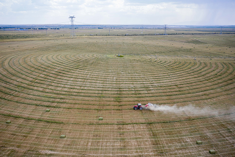 在宁夏盐池县冯记沟乡平台村的优质牧草基地,农户用机械将牧草打捆(无人机照片,2021年7月14日摄)。新华社记者 杨植森 摄