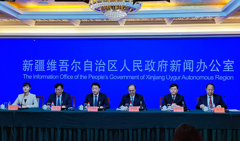 3月2日拍摄的新疆维吾尔自治区人民政府举行的新闻发布会现场。新华社发(张乾 摄)